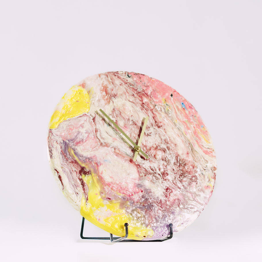 The patterns are unique blends of plastic melted up and artisanally smooshed together by hand to create swirling planetscapes of color and texture. Each clock is completely unique and irreproducible. The clock movements are quartz timing made in the USA.